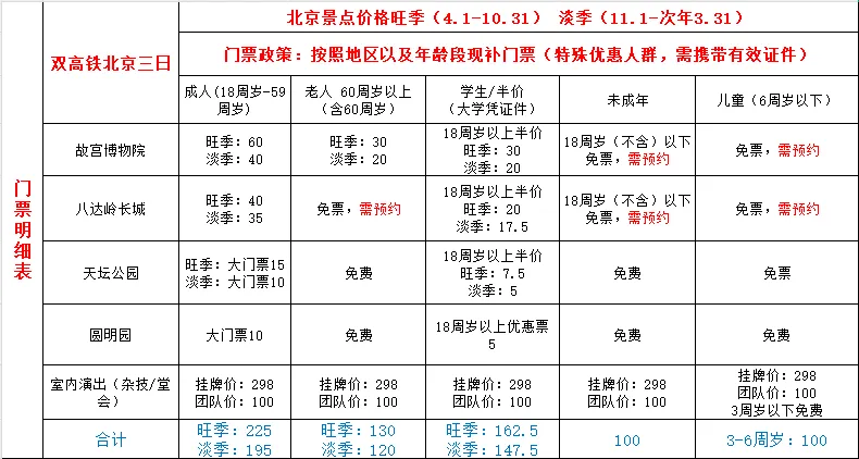 交通:北京往返高鐵二等座;(不指定車次,隨機出票,不保證挨著車座),當地一車一團,每人一正座;(游客因個人原因在出行前7天內退團,需要承擔報名費60%的車位損失費!敬請您合理安排出游時間,避免損失。)