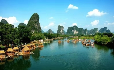 早餐后出發前往漓江碼頭,乘船游國家5A級“百里畫廊” 【漓江風光】(三星船,磨盤山-陽朔:游船約為3.5小時),感受唐代詩人韓俞筆下:“江做青羅帶,山如碧玉簪”的漓江風光,漓江像蜿蜒的玉帶,纏繞在蒼翠的奇峰中,造化為世界上規模最大、景色最為優美的巖溶景區。沿途欣賞楊堤煙雨,浪石仙境,九馬畫山、黃布倒影,興坪佳境……抵達陽朔碼頭前往停車場;
