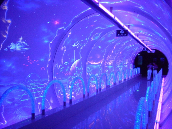 國內(nèi)絕無僅有的熒光純手工壁畫,由日本著名熒光畫大師遠(yuǎn)山先生花了3個多月畫成,價值超三百萬元。整個壁畫描述了海洋形成、發(fā)展過程和未來的遐想,即海洋的昨天、今天和未來,在這里你可以完全放飛你的想象;該壁畫另一奇妙之處:如果關(guān)閉熒光燈,壁畫會變成一面白墻,什么也不見,但是打開熒光燈后,畫面栩栩如生,層次分明,你不得不驚嘆大師的高超技藝。