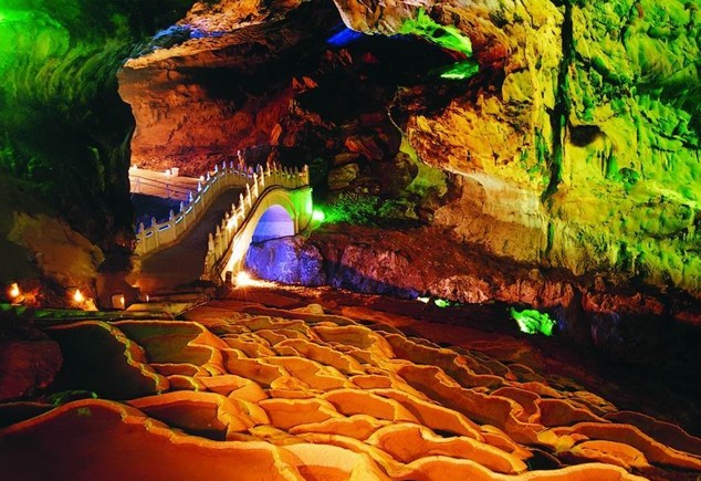 洞內(nèi)有無數(shù)千姿百態(tài),瑰麗多彩的鐘乳石,游覽范圍共分三層:上中兩層為陸地層,廳堂高大寬闊,巖壁堅固,雄偉壯觀,“瀑布”“山林”“谷”“田園”“瑤寨”百花爭艷,鳥飛云走……;下層是一條地下暗河,由北向南蜿蜒1500米,經(jīng)過三個美麗的峽谷,穿過四座山頭底部,河面寬1.6米,水深1-7米,兩岸奇景密布,巧奪天工,美不勝收。有洞中之寶”金雞報喜”飛象過河”還有地下河最高最大,版權(quán)所有山東聊城聊之旅國際旅行社有限公司,轉(zhuǎn)載必究!一物兩景的“壽星公”“飛瀑奇石”“花鳥神閣”……。各處自然美景無不讓人吧為觀止。樂而忘返!