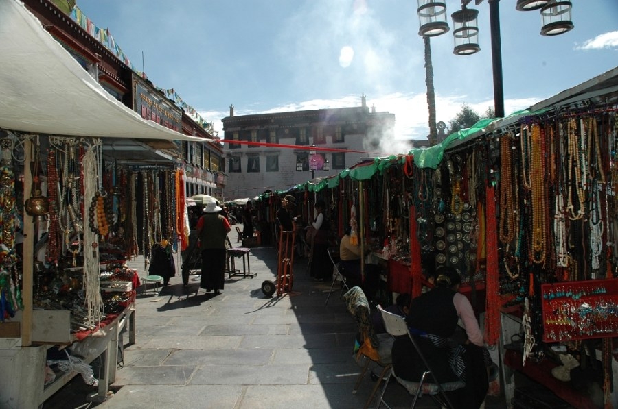 直到解放前,八角街的外圍還算比較寬敞,貴族們的官邸都建在八角街的外圍。但那時,八角街卻早已是包羅萬象、無所不有的拉薩社會生活的縮影了。從街面上看,這里到處是高聳的一幢挨一幢的藏式樓房,這些樓房中有的是白墻紅頂,顯得氣派宏大;有的披滿灰塵,墻體歪斜,顯得簡陋。那時,八角街里既有噶廈政府、地方法庭、監獄等機構,又有商店、攤點、手工作坊。這里住著貴族、僧人、學者,也住著木匠、銀匠、鐵匠、畫匠、裁縫等手藝人和平民。這些人在無數的小貨攤、小帳篷底下,或在一間挨一間的向里伸展進去的小店中,進行著各式各樣、豐富多彩的交易。在八角街的手工作坊里,人們還生產出氌氆、地毯、藏被等生活用品。這里是西藏商品、物資的集散地,也是西藏民族文化的“百科全書”。八角街轉經道編輯八角街轉經道是藏族群眾心中最重要的一條轉經道,藏語意為“中圈”,是相對于“林廓”和大昭寺內的“囊廓”而言。傍晚轉經的特定時間一到,那些互不相識的人們-有來自藏北牧區穿白袍的,有來自康巴山地盤英雄結的,還有住在八角街區、衣著亮麗的……總之,各式各樣的信徒,象是突然接到了一項無聲的命令,在使人猛然感到一陣騷動之后,便開始嚴格地按順時針方向沿著這條環形路走下去。八角街內的古跡編輯圍繞著八角街的轉經路有許多古跡。在環形路與公路交叉的道口上,曾經豎立著一個高高的名叫“覺牙達金”大法輪柱。藏族姑娘年滿十六歲,就要到覺牙達金大桅桿前舉行一個慶賀成年的儀式。沿著轉經路走,在八角北街24號院子里,有一幢看起來很普通的兩層高的小樓名字叫“曲結頗章”,就是赫赫有名的“法王宮”,是四大宮殿中的第一座,也是八角街的第一所房子。它是在修建大昭寺之前,松贊干布為自己建造的一個簡樸的行宮。從八角北街24號出來,繼續前行,人們會在白色的香塔前發現一處開闊的小廣場。那小白塔過去是專門為財神爺燒香的,它保佑著在香塔四周做買賣的生意人。