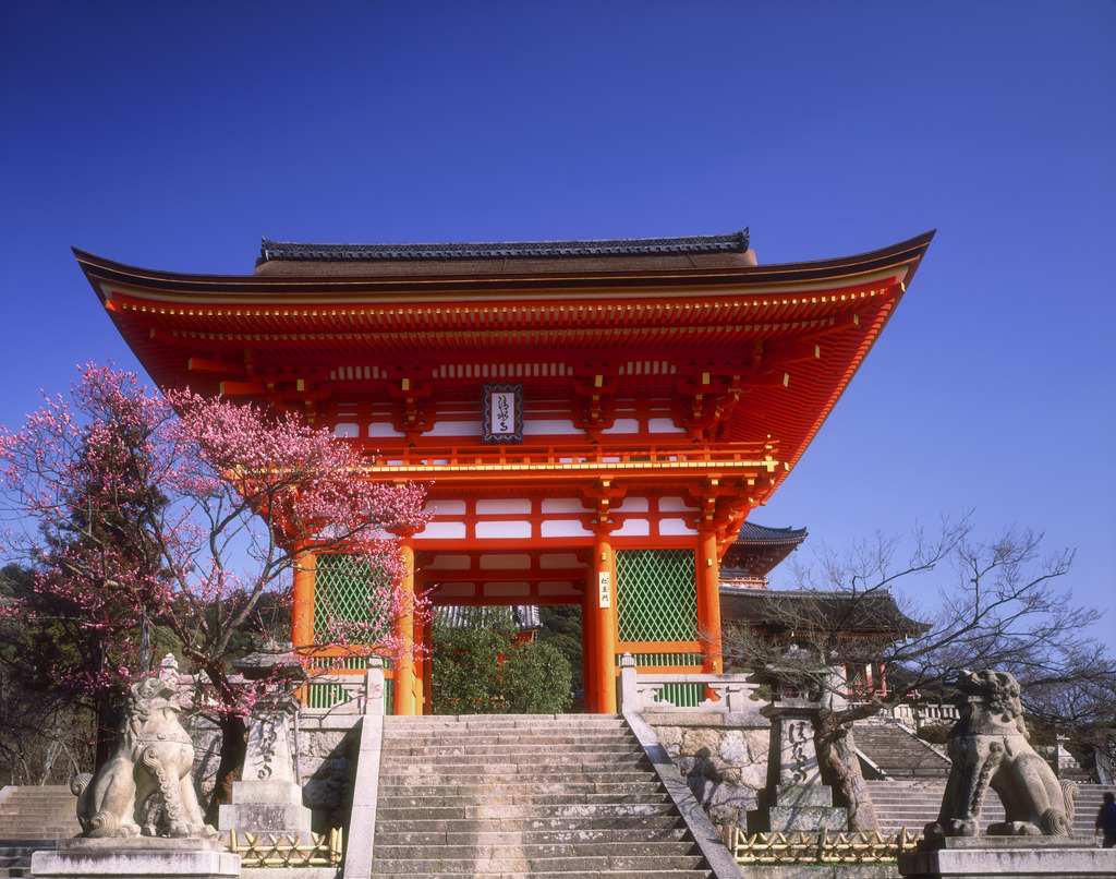 本堂的下方有著名的“音羽瀑布”,與祈求分娩順利的“子安塔”,后者被列為世界文化遺產(chǎn),清水寺建于音羽山上,為日本佛教北法相宗的總院。寺院周?chē)蔷┒嫉拿麆俟袍E,春天櫻花盛開(kāi),秋天紅葉似火。