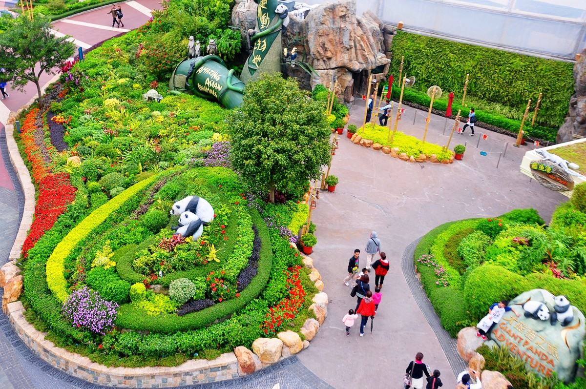 香港海洋公園分為3部分,分別為位于北面的山下花園,和南面的南朗山南麓及大樹灣,占地共17公頃,有40多個游樂設施。山下花園與南朗山以登山纜車和海洋列車連接。而南朗山與大樹灣之間,則以登山電梯連接,是全世界第2長的戶外電動扶梯。
