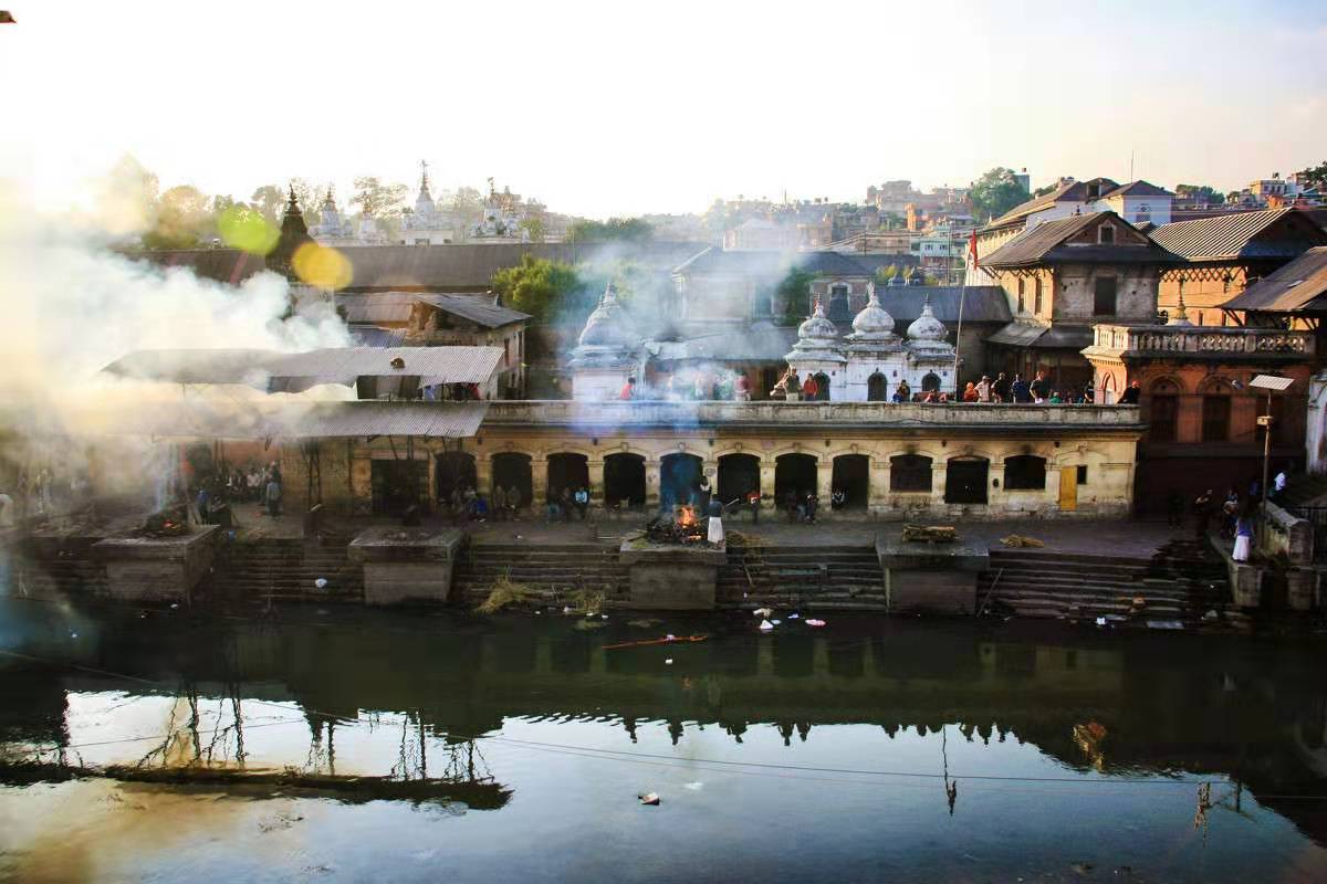 帕斯帕提納神廟外的巴格馬蒂(Bagmati)河畔有六座石造的火葬臺(tái),是尼泊爾印度教徒舉行露天火葬的場(chǎng)所。逝者的骨灰會(huì)被灑入河里,隨波而逝。作為印度教徒,尼泊爾人相信這樣做,靈魂便可獲得解脫。