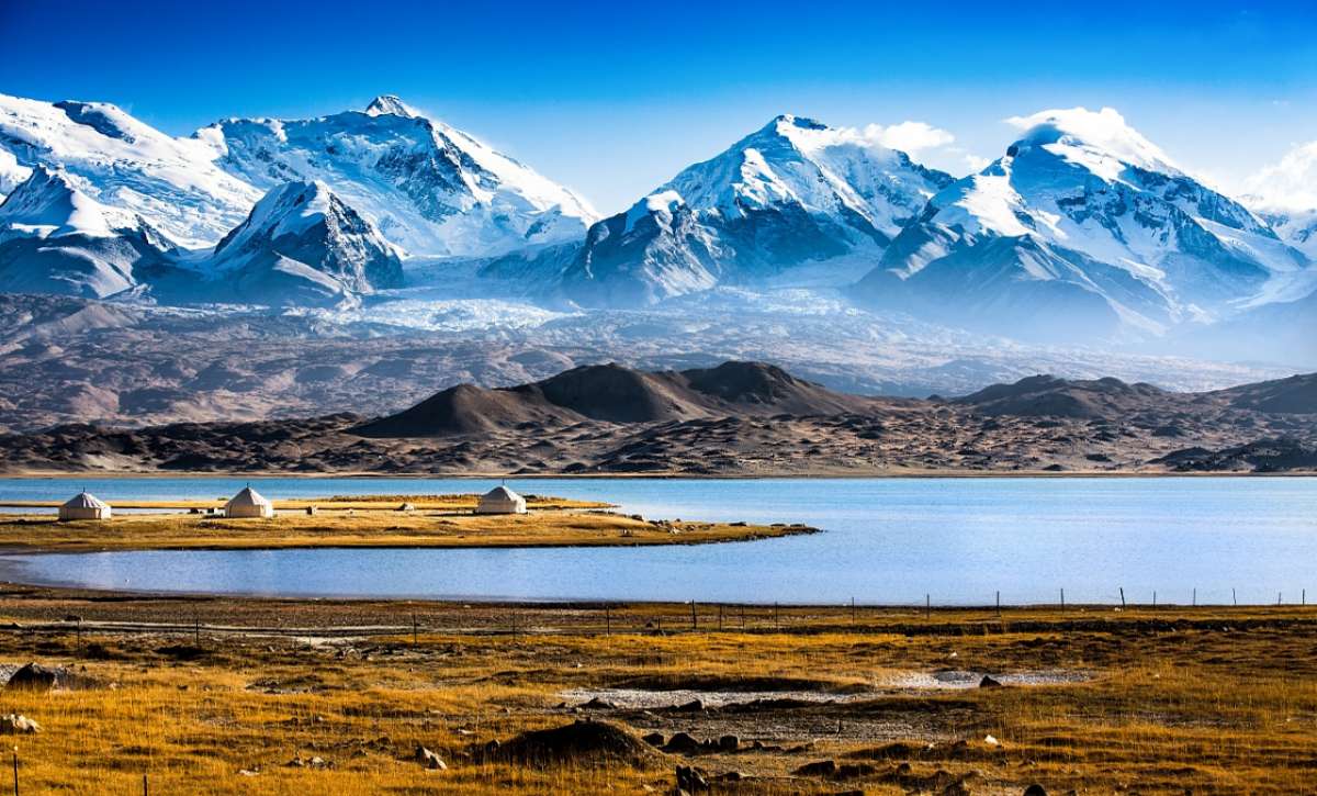 卡拉庫里湖并不是很大,若不是高大的公格爾峰、公格爾九別峰、慕斯塔格峰緊挨著湖邊,卡拉庫里湖著實沒那么出彩。然而有了山就不同了,繞湖一圈,幽藍的山脊倒映在更加幽藍的水面,湖光山色,頗令人有些美好的遐想。湖邊有氈房、木板房可供旅游者下榻,包括新鮮蔬菜在內(nèi)的風味餐,欣賞帕米爾高原的大好風光。