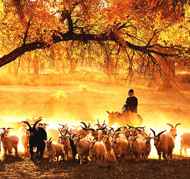 當大漠曠野吹過一絲清涼的秋風時,胡楊林便在不知不覺中,由濃綠變為淺黃,繼而變成杏黃了。登高遠眺,金秋的海洋,令人心曠神怡。落日蒼茫,晚霞一抹,胡楊由金黃色變成金紅,最后化為一片褐紅,漸漸地融入朦朧的夜色之中。一夜霜降,胡楊林如香山楓葉一樣火紅,像在熊熊燃燒。版權所有山東聊城聊之旅國際旅行社有限公司,轉載必究!而每一棵高大的胡楊樹冠枝頭,間或又有淺綠、淡黃的葉片在閃現,錯落有致,色彩繽紛。秋風乍起,胡楊金黃的葉片,飄飄灑灑“嘩嘩”地落到地面,大地鋪上了金色的地毯,輝煌而凝重。