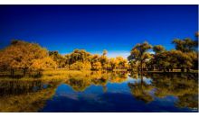 周邊分布大面積的沙棗樹、白楊、紅柳等大西北特有的樹種,該胡楊林分布密集,長勢良好,規模居全省之冠,極具旅游開發價值,不久的將來這里便會更加為人們所熟知。金秋十月的胡楊,綠色的樹葉有的已經變黃,已經變黃的胡楊樹,在湛藍的天空下,在荒蕪的沙漠中如陽光一般明媚燦爛。