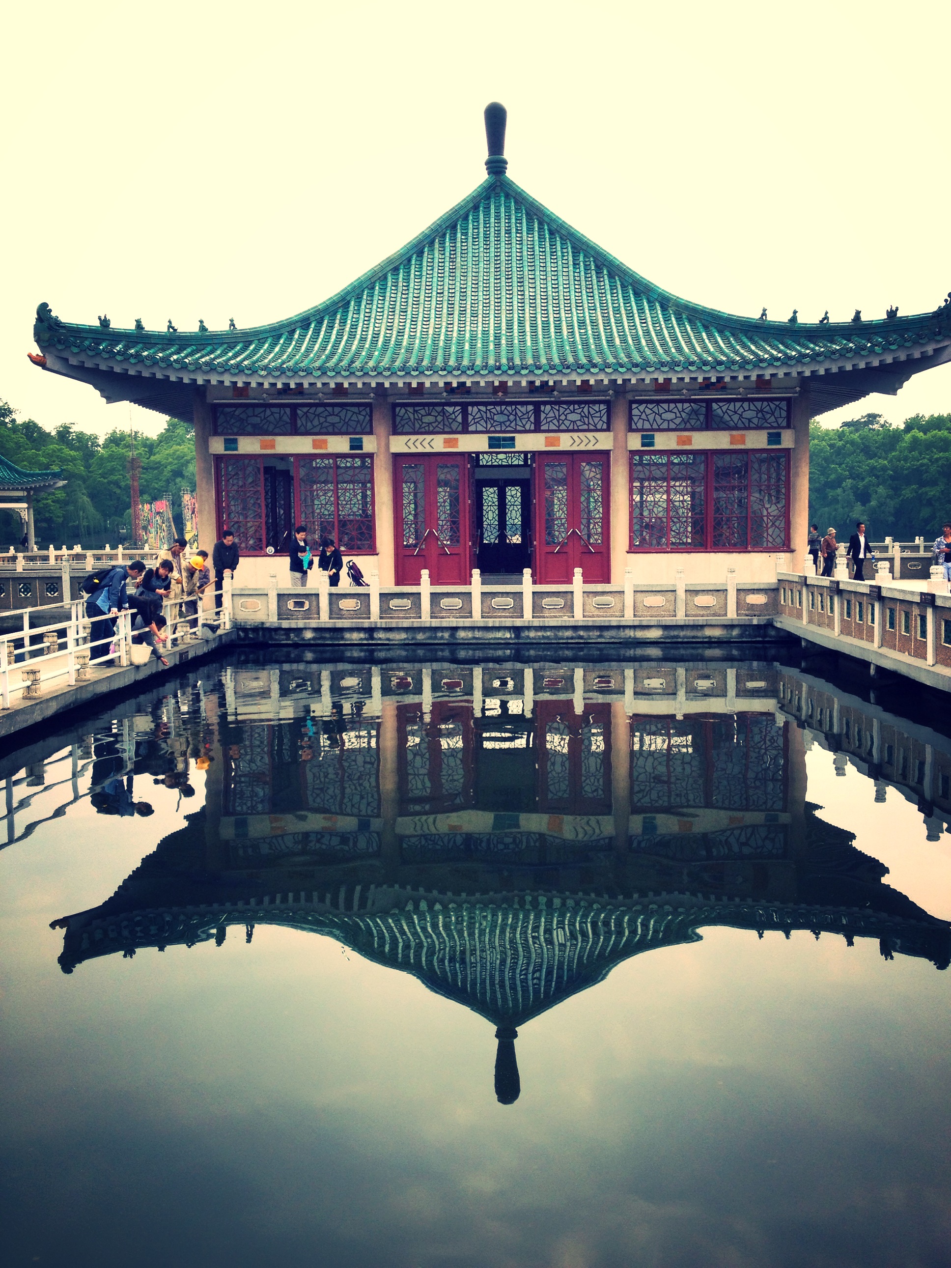建于湖心小島上,由十里長堤與陸地相連,原名“中正亭”,1931年為紀念蔣介石五十壽辰而建,后改稱“湖光閣”。閣為三層六面,飛檐綠瓦,登閣四顧,游船輕移,景象萬千。霧日,水天一色,湖光高閣,似蓬萊仙境,無不令人向往。