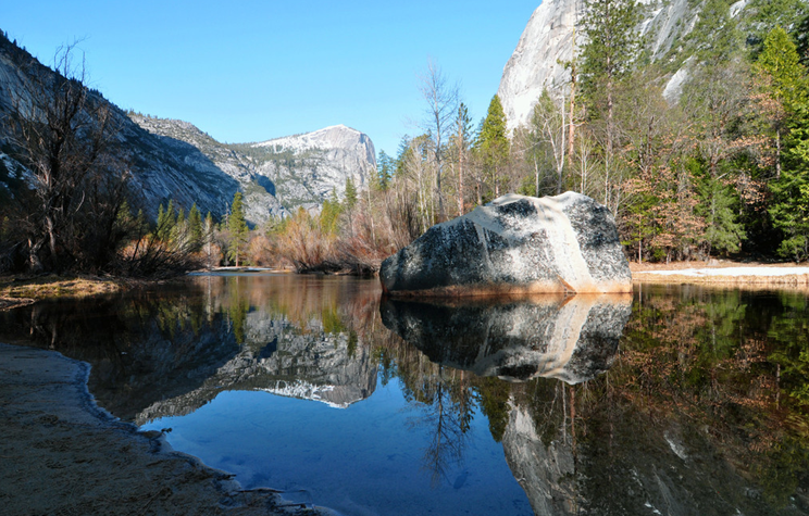 約塞米蒂的巖石會你從心底感到震撼——你會真正認識到自然的鬼斧神工。光滑花崗巖最完美的部分分布在海拔2400~2700米的地方,有的方圓達數公里,光滑的花崗巖上面只有星星點點的疤痕,那是風雨在上面的歲月留痕。保存最完好的部分光彩照人,像平靜的水面和玻璃一樣反射著陽光,盡管數千年來它們一直暴露在風吹雨打之中,但它們每天都像被擦亮了一樣光芒四射。