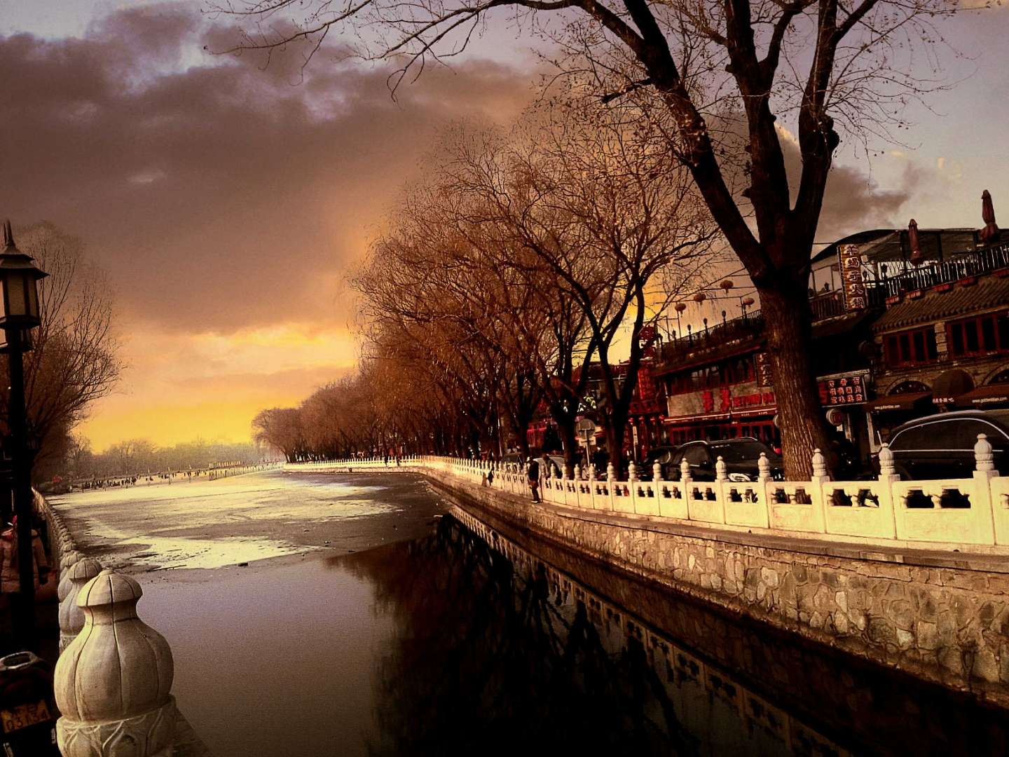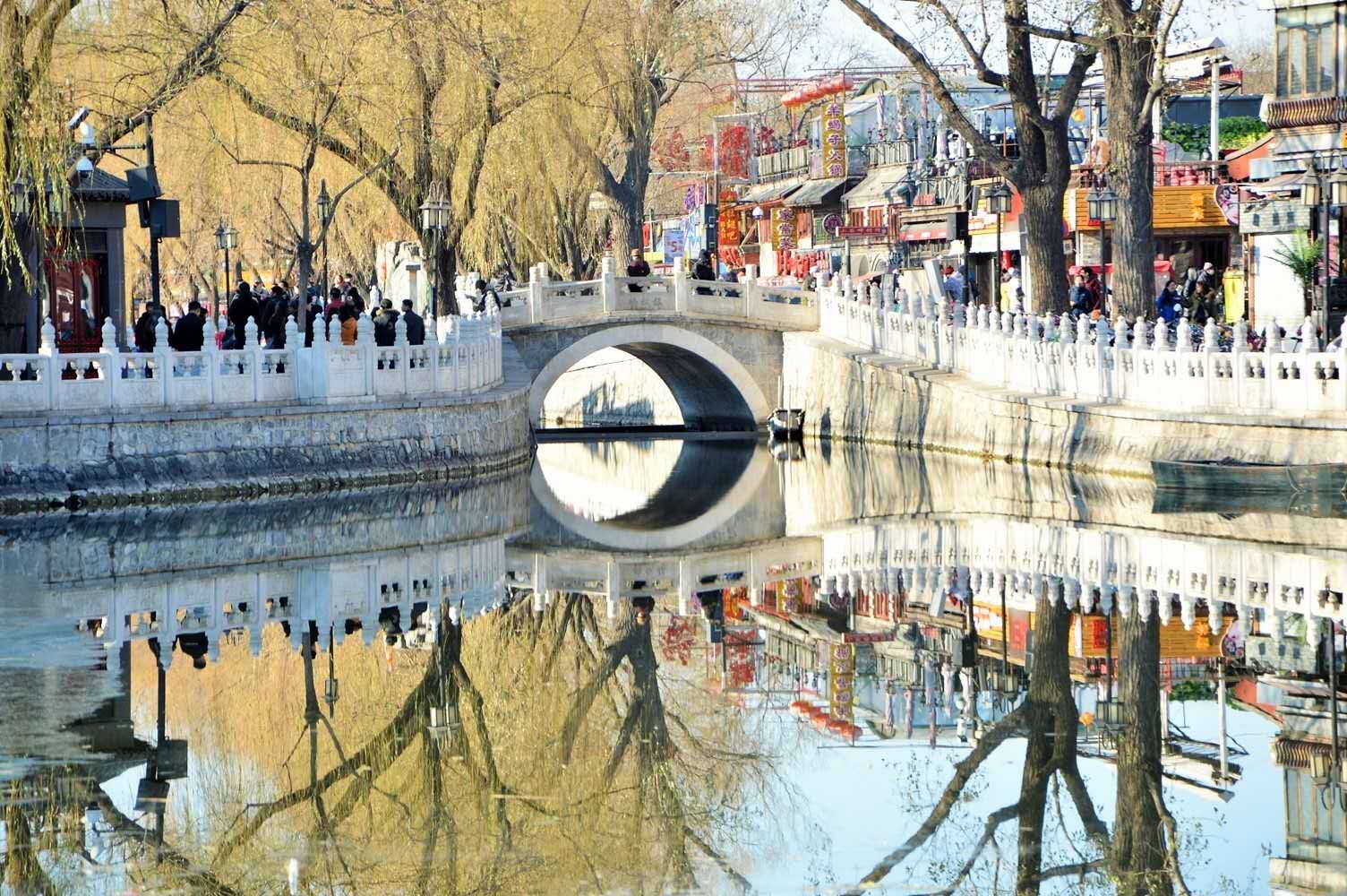 元代營建新大都后這里已是船泊必經之處,兩岸商事繁華,又是風景勝地。遼、金時代雖是郊外,數公里長的水系兩岸也應有便橋方便來往。明代史籍已有明確的記載。解放初期,當我們站在銀錠橋頭平目西望,遠處藍天下的青山綿延起伏,湖邊搖曳的柳絲楚楚動人,猶如掛在空中美麗的巨幅圖畫,每當夕陽西下,金色的余輝從山后撒播在湖面上,微波粼粼,金光閃閃,迷人的湖光山色令人流連忘返,可惜后來的煙囪和高樓大廈嚴重地破壞了京城這難得的獨特景觀,但愿這遺憾和教訓不再發生。
