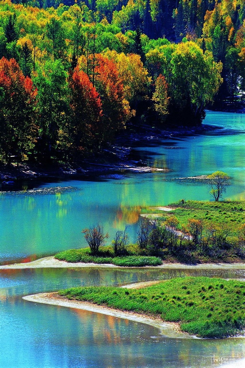 深秋時節(jié)是月亮灣色彩最豐富景色最迷人的時候。山頂?shù)难┖涂~緲的霧是白色,山腰的西伯利亞落葉松和白樺樹的葉是金黃色,間雜其中的冷杉和云杉翠綠色,河水是翡翠色,九月底的月亮灣還有楓樹的紅葉映襯,簡直就是上帝的調(diào)色板。