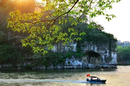 詩人以訾洲之紅葉來贊美桂林秋天,當霜染訾洲紅葉之時,便是桂林秋天到來之際,這種片片紅楓飄枝頭的景象又被稱為鴻運當頭。每到秋天,島上紅黃楓葉嬌艷絢麗,頗為壯美。