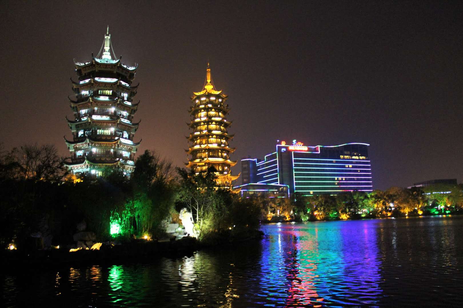 日月雙塔坐落在杉湖中,日塔為銅塔,位于湖中心,高41米,共9層,月塔為琉璃塔,高35米,共7層。兩塔之間以18米長的水下水族館相連。版權所有山東聊城聊之旅國際旅行社有限公司,轉載必究!銅塔所有構件如塔什、瓦面、翹角、門拱、雀替、門窗、柱梁、天面、地面等均由鋼材鑄鍛而成,并以精美的銅壁畫裝飾,整座銅塔涵蓋了三項世界之最--世界上最高的銅塔,世界上最高的銅質建筑物,世界上最高的水中塔。日月雙塔是桂林兩江四湖夜景重要的景色之一。