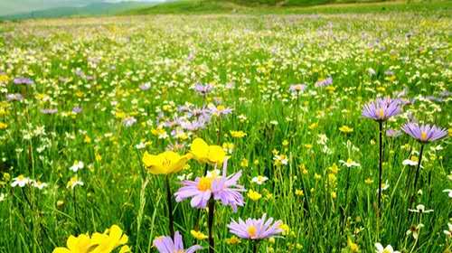 花湖位于四川若爾蓋和甘肅郎木寺之間的213國道旁,是熱爾大壩草原上的一個天然海子。熱爾大壩是我國僅次于呼倫貝爾大草原的第二大草原,海拔3468米?;ê浀涞臅r間是在五六月份,湖畔五彩繽紛,好像云霞委地,而湖中則開滿了水妖一樣的絢麗花朵,這種植物看起來平淡無奇,在雨水充沛的八月把純藍的湖水染成淡淡的藕色,時深時淺,像少女思春時低頭的一抹酡紅。