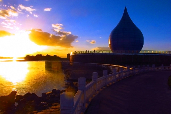 黃河宮主體建筑高36.9米,創意采用唐朝詩人李白“黃河之水天上來”的詩詞寓意,將黃河之水凝練成水滴建筑形態。建筑里沿內壁有人行觀景坡道,中間設電梯和80多平方米的觀景臺。水滴主體建筑下就是黃河博物館。