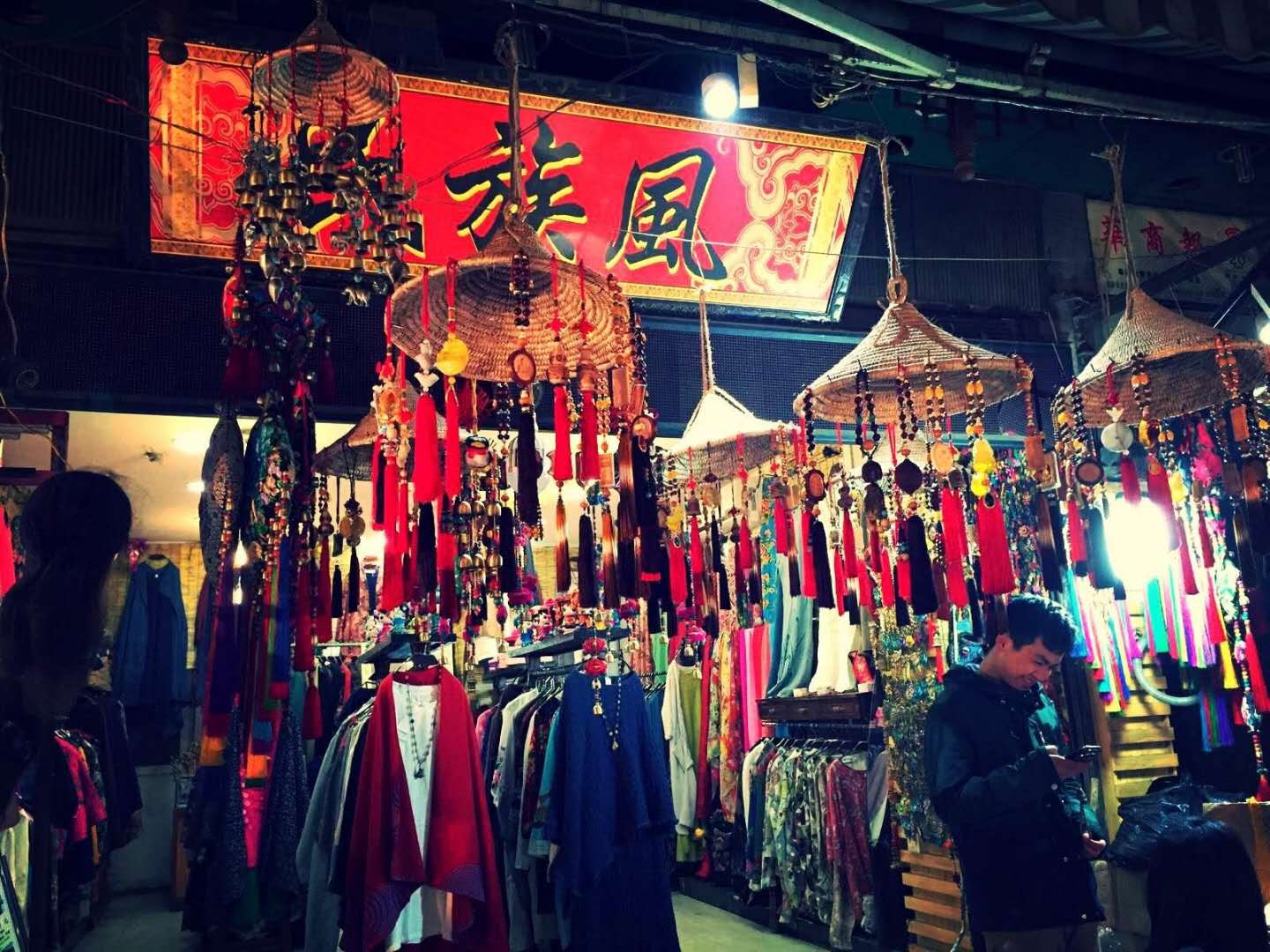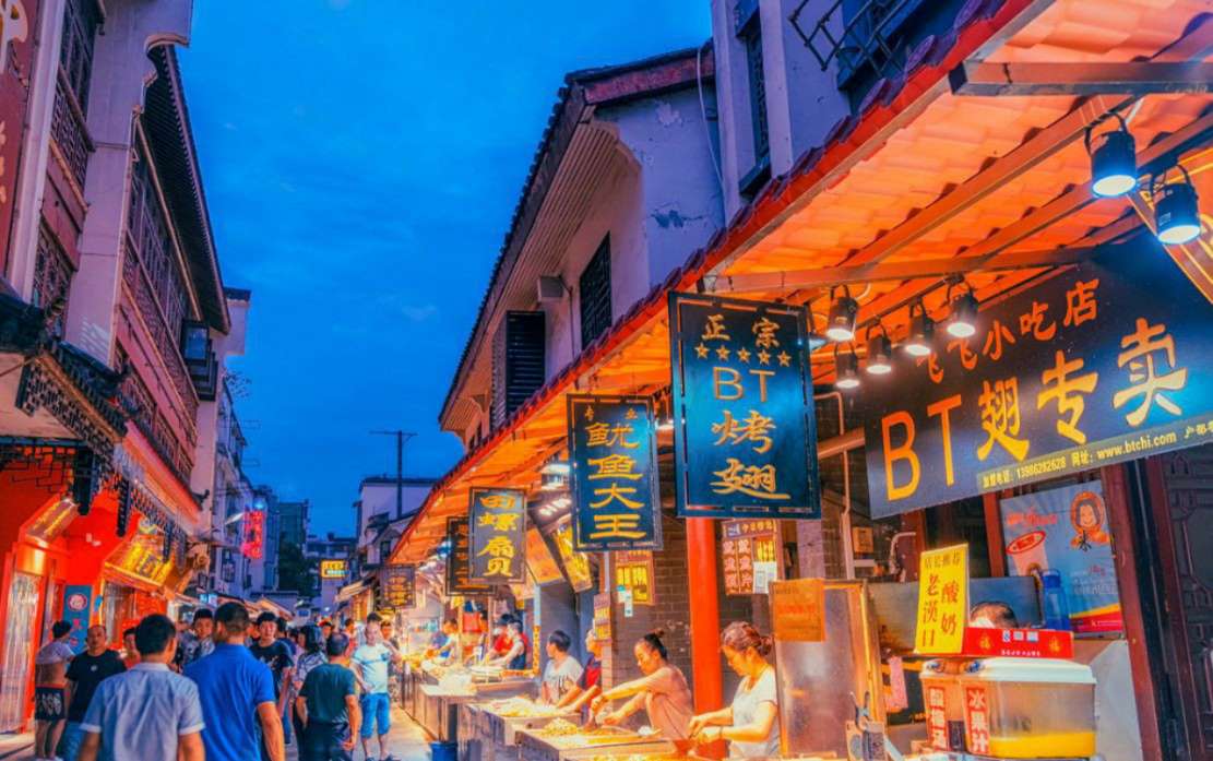 滿為患,連店門口也會擺滿桌椅。烤肉串、涮牛肚的煙火在不甚明亮的燈光下彌漫整條街,熙熙攘攘的人群都是邊逛、邊吃,看到小攤上中意的東西就和攤主還還價。還可以到鼓樓廣場的座椅上歇歇腳,看賣風箏的小販把數(shù)十米長的風箏一直放到馬路對面的高樓頂上,一切都充滿真實熱鬧的生活熱情。
