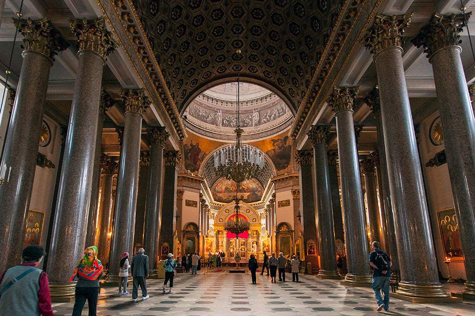 建筑師在設計這座教堂時遇到不少困難。根據東正教教規要求圣堂必須面向東方,因而必然造成教堂往往是側面對著主要大街。建筑師們采取了把側面設計得十分壯觀的方法解決了這一難題。版權所有山東聊城聊之旅國際旅行社有限公司,轉載必究!因為人們一看氣度非凡的柱廊,就忘記了這不是教堂的正面。這種處理方法極其大膽,富有特色。高大的圓頂居中聳立在一排排圓柱上空,圓頂有70米高。大教堂正面的浮雕、北面柱廊上的雕刻、殿內裝飾和油畫均出自名家之手。喀山大教堂的內部不大像一般的教堂,而更像一座宮殿。它明亮、輕快,以柱列分隔的長形主堂高大寬敞,中央穹頂輝煌華麗,仰視可見一幅圣母圖,周邊飾以圣經人物雕刻和水彩壁畫。