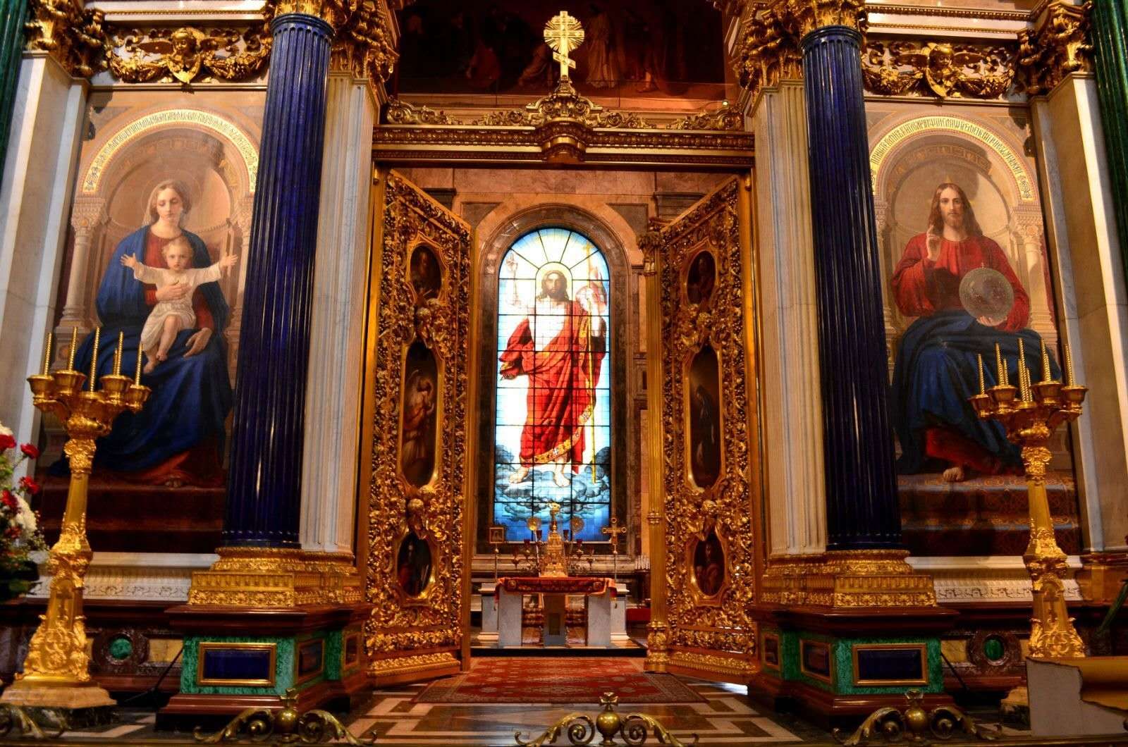 教堂內部使用有色大理石、孔雀石、青金石等進行裝飾。使用鑲嵌畫手法繪成的圣像中,大部分都是珍品,在中央圓頂下的卡爾·布留洛夫的作品《玉座上的圣母瑪利亞》是最值得一觀的,而裝飾教堂的300多幅浮雕和雕像個個精致無比。