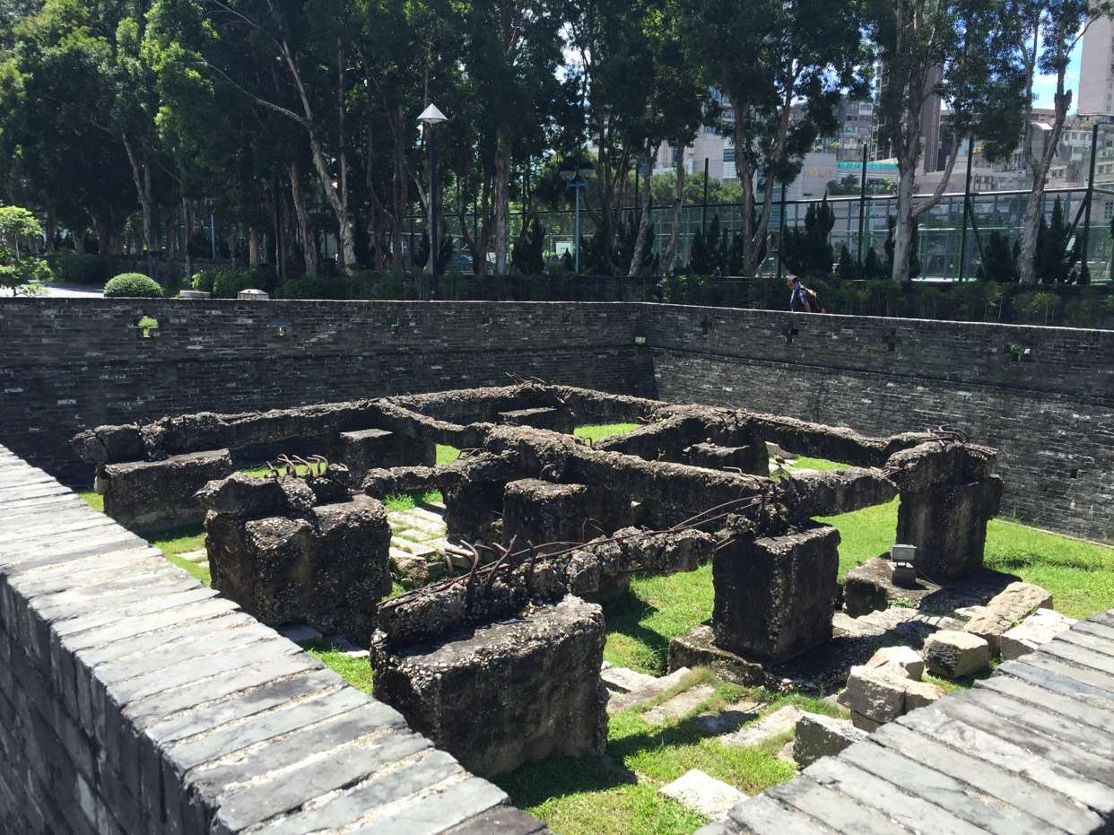 踏進公園南門,兩旁灰色的四方磚柱上,分別有“九龍寨城”和“南門”的大字鐫刻。繞過刻有公園碑記的照壁,景物豁然開朗,一座三進的衙門映入眼簾。這是寨城內惟一保留下來的古建筑,修葺后回復本來的面貌,立于公園中心。衙門前有古炮兩尊,西側尚存一方古井。衙門內陳列著一些在寨城中發掘出來的文物,包括刻有大鵬協副將張玉堂拳書“墨緣”和“壽”字的兩塊石碑等。衙門大堂還陳展著1902年寨城的平面圖,圖文并茂地介紹寨城的歷史和公園興修的經過。