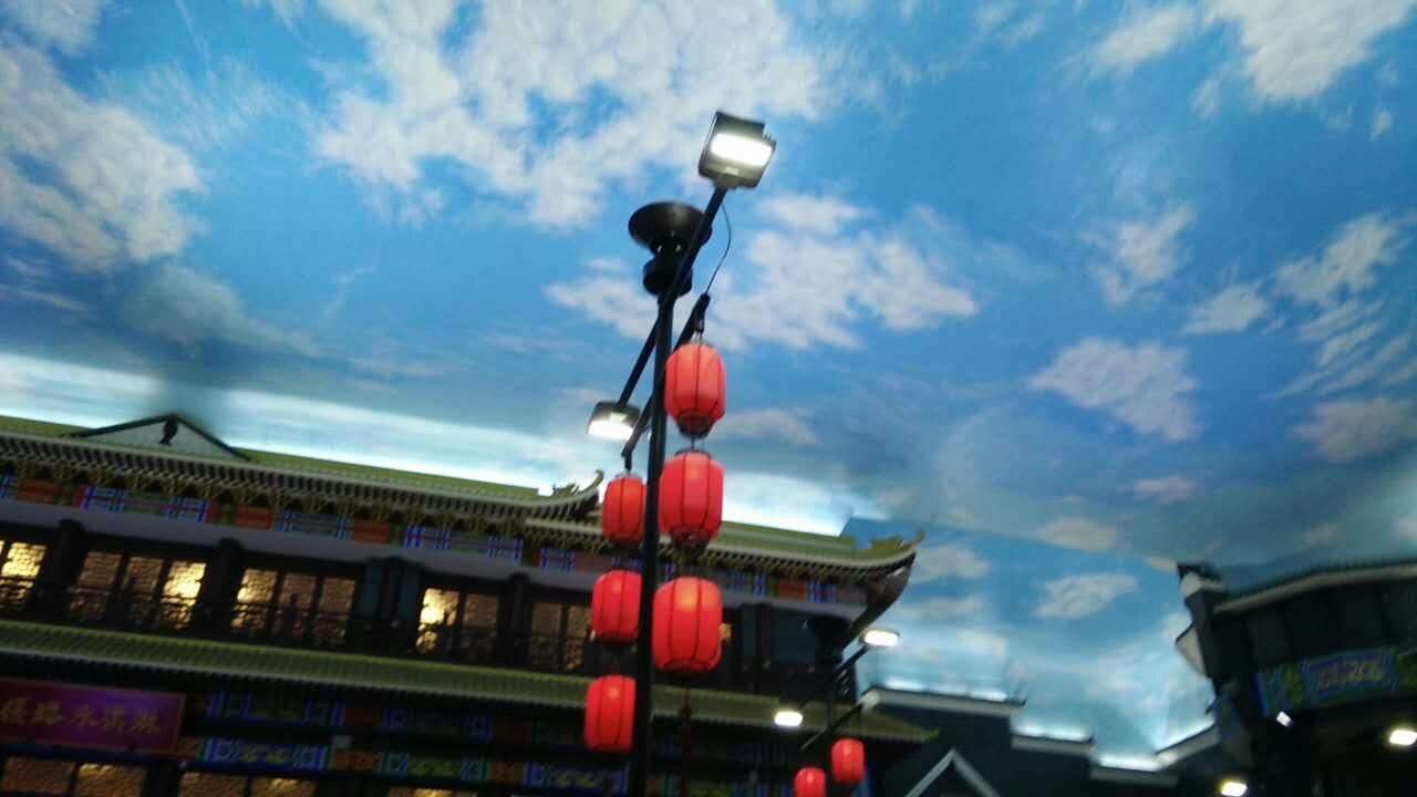 抬起頭,房頂噴繪的藍天白云,加上周圍小吃攤販身上的古裝,制作木板年畫的老師傅縱橫的皺紋,以及路邊一排繡娘手中的銀針,讓來者一時忘憂。