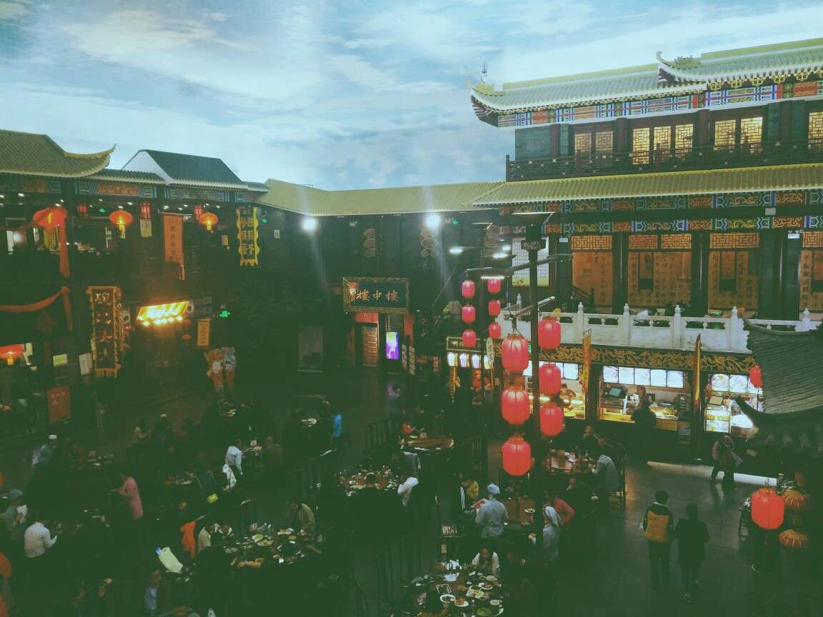 小宋城的綜合營業區設置在一二層,整個營業區內以木質仿古建筑為主,回廊流水,亭臺樓榭及戲臺上傳出的傳統戲曲演唱聲,仿佛瞬間把人帶回了質樸又輕緩的北宋時代。