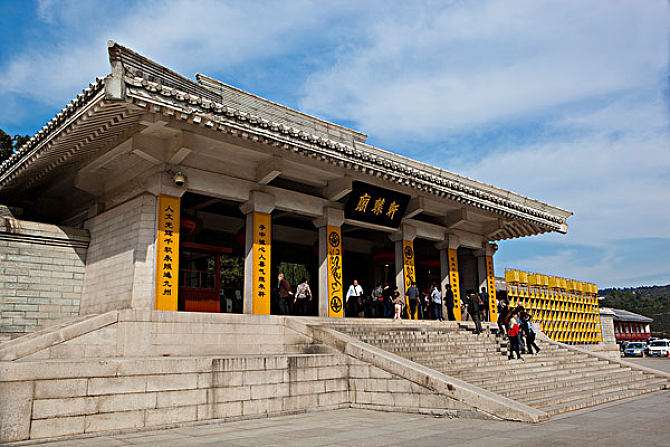 大殿氣勢雄偉。正殿門楣上懸掛有原國民黨愛國將領程潛于1938年祭陵時所題“人文初祖”四字大匾。字體鐵畫銀鉤,剛中藏秀。大殿正中木質壁龕內供放著一尊軒轅黃帝全身浮雕像。這尊中華民族人文始祖的浮雕像,是以東漢武梁祠的畫像石刻拓片為藍本,經國家文物局批準,放大刻制而成。版權所有山東聊城聊之旅國際旅行社有限公司,轉載必究!黃帝浮雕像,石料采用陜西富平墨玉,高3.9米,寬3.3米,重11噸。石浮雕像沉穩站立,抬臂揚手,顯軒轅黃帝雄才大略之氣概;雕像冠帶簡樸,著裝無華,顯示出遠古之神韻。神龕四周的圖案為:上朱雀,下玄武,左青龍,右白虎。神龕與軒轅黃帝浮雕像都是香港同胞湛兆霖、程萬琦于1987年清明節專程前來祭陵時,捐款8萬元人民幣制作的。殿內兩壁原有壁畫,繪軒轅黃帝一生的功德,后毀于明代。現大殿神龕周圍放置有花籃。神龕前供桌上有祭器、祭品等。殿外左右及背后有磚砌花墻。大殿前月臺寬21.1米,進深10.84米,置有香爐、香案。月臺前有臺階通道三處,中間臺階正中為一圓形二龍戲珠石雕。正殿前柱子上,書有一副楹聯:“祖功澤百世,宗德潤千秋。”