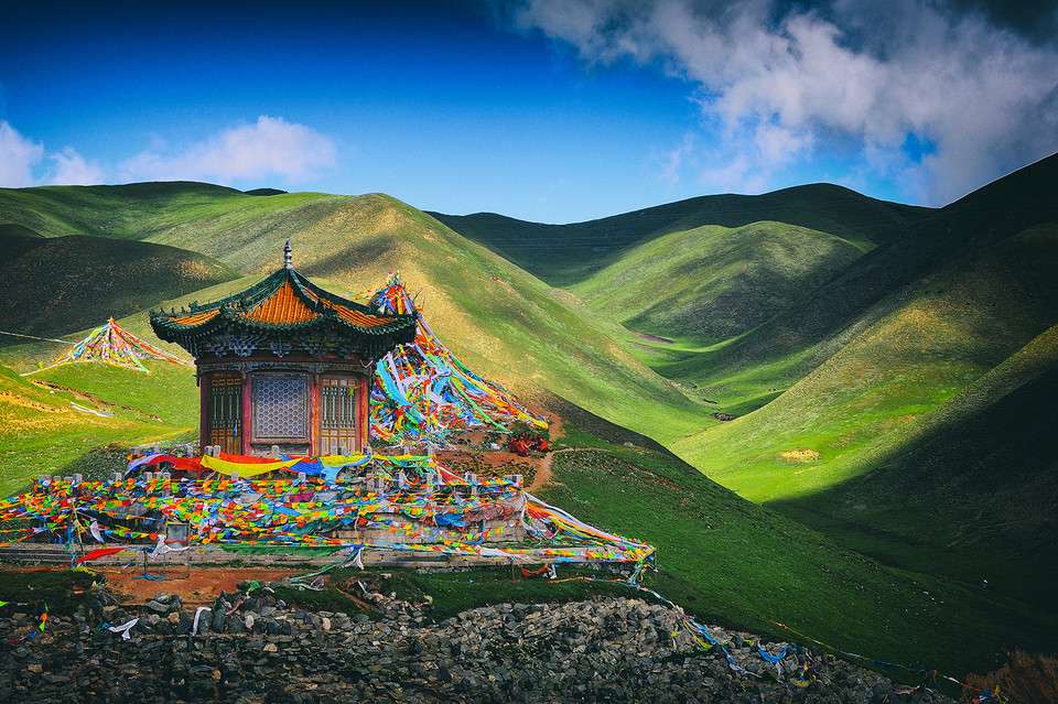 今天的日山和月山上各修建了兩座亭子,分別叫日亭和月亭,經(jīng)幡飄舞的亭子里面用碑文和壁畫(huà)記錄了公主入藏時(shí)的種種情景。山上是無(wú)數(shù)藏人用虔誠(chéng)和信仰堆起的瑪尼堆,石堆上插滿了盤(pán)樹(shù)虬枝。版權(quán)所有山東聊城聊之旅國(guó)際旅行社有限公司,轉(zhuǎn)載必究!山下是文成公主廟,矗立著巍峨的文成公主漢白玉雕像。藏歌悠悠,牛羊如云,無(wú)數(shù)經(jīng)幡和高昂的藏歌迎著日光漠風(fēng)飄揚(yáng),表達(dá)出一代又一代人們對(duì)那美麗靈魂的深深崇敬。