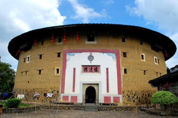 懷遠樓是雙環圓形土樓,簡氏家庭住宅,建于清宣統元年(1909年),坐北朝南,占地1384.7平方米,高4層,1 4.5米,每層34間,共136間。樓門上有楹聯“懷以德敦以上藉此修齊遵祖訓,遠而山近而水憑茲靈秀育人文”。懷遠樓最引人注目之處,在于內院核心位置的祖堂也就是家族子弟讀書的地方“斯是室”。