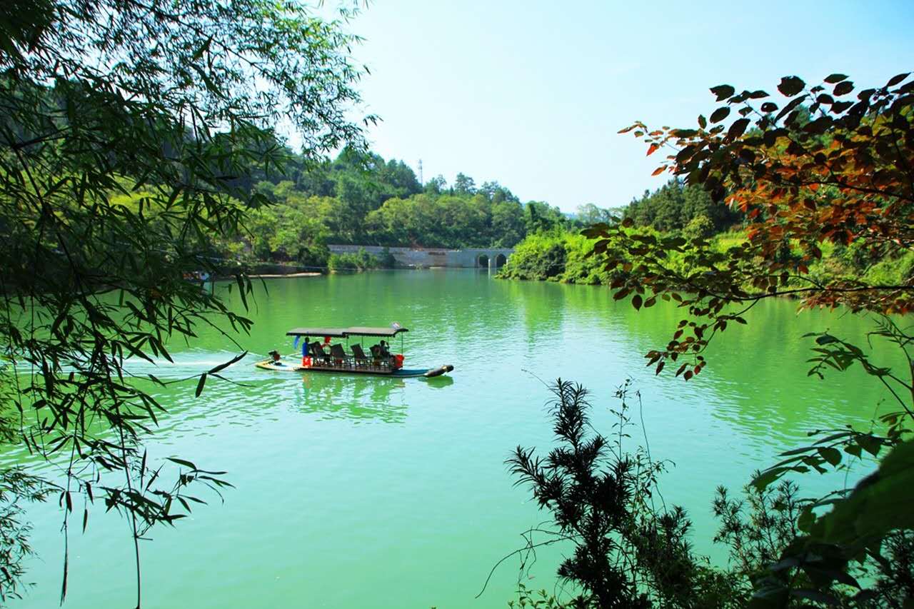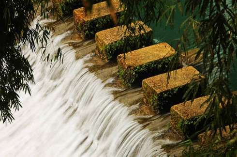方村河伏流出露不遠,有一橫跨河兩岸的天然巨巖,是喀斯特是貌奇觀之一,谷稱天生橋,又謂仙人橋。高60米,厚10多米,橋孔寬20多米,河水流過橋后,還形成2米多高的大瀑布。仰觀橋孔下,只見巨型鐘乳懸掛,橋腳、橋側的裂隙石縫長出綠石草叢灌木,藤蘿花卉纏裹橋身,真是滿目琳瑯、五顏六色的天然大彩橋。橋下瀑布前水激浪涌,小船不能靠近,到此必須停船,把船扛在肩上攀登危巖,超過瀑布,又才能逆流行舟在暗河峽谷之中。此景驚險,別具一番樂趣。