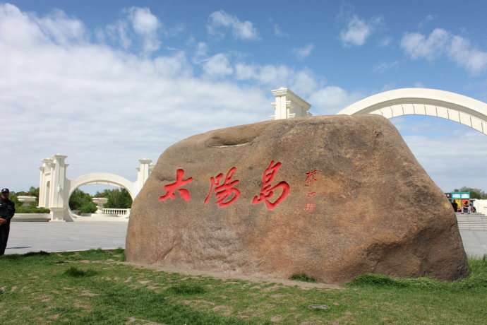 太陽石:在太陽島東區(qū)入口處,矗立著一塊長7.5米,厚2米,高4.3米,重150噸的天然奇石,這就是太陽石。奇石出于金源故地。