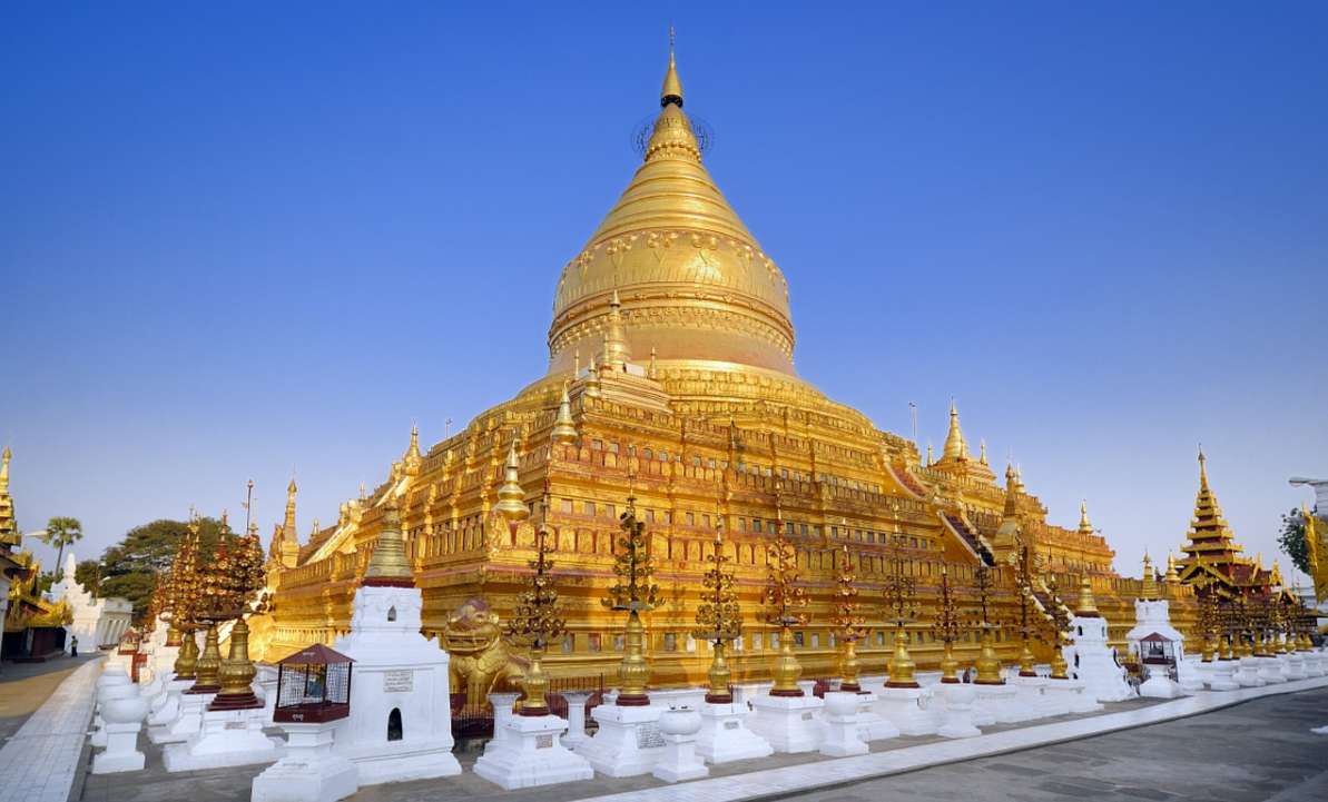 公元1059年,蒲甘王朝的阿奴律陀主持修建了瑞喜宮佛塔,當時的瑞喜宮佛塔作為皇家佛塔修建。當時,塔內供應佛的前額骨和佛齒。可惜的是阿奴律陀最后沒能看到佛塔的完工,他的兒子江喜陀王繼位后,繼續修建佛塔。版權所有山東聊城聊之旅國際旅行社有限公司,轉載必究!佛塔終于在公元1090年竣工。整座塔呈現了金鐘形,底座呈八角型,有三層四方形的塔基。整座佛塔精美絕倫,細致的雕刻和優美的造型呈現出一種難以用言語表達的美感。在入口處立著獅子像,和瑞喜宮佛塔塔身一樣一樣,全身金光閃閃。