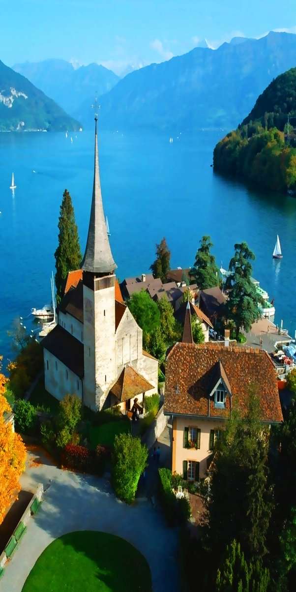 英特拉根市西面是圖恩湖,東面是布里恩茨湖。兩湖都為狹長形,略向北翹,加在一起像一彎中間斷開的新月。其中圖恩湖面積較大,但湖水不深,游人可乘船暢游,也可驅車或搭火車沿湖觀光。玲瓏的村莊或高棲坡崗,或依立水邊,裝點著大自然的妖媚。