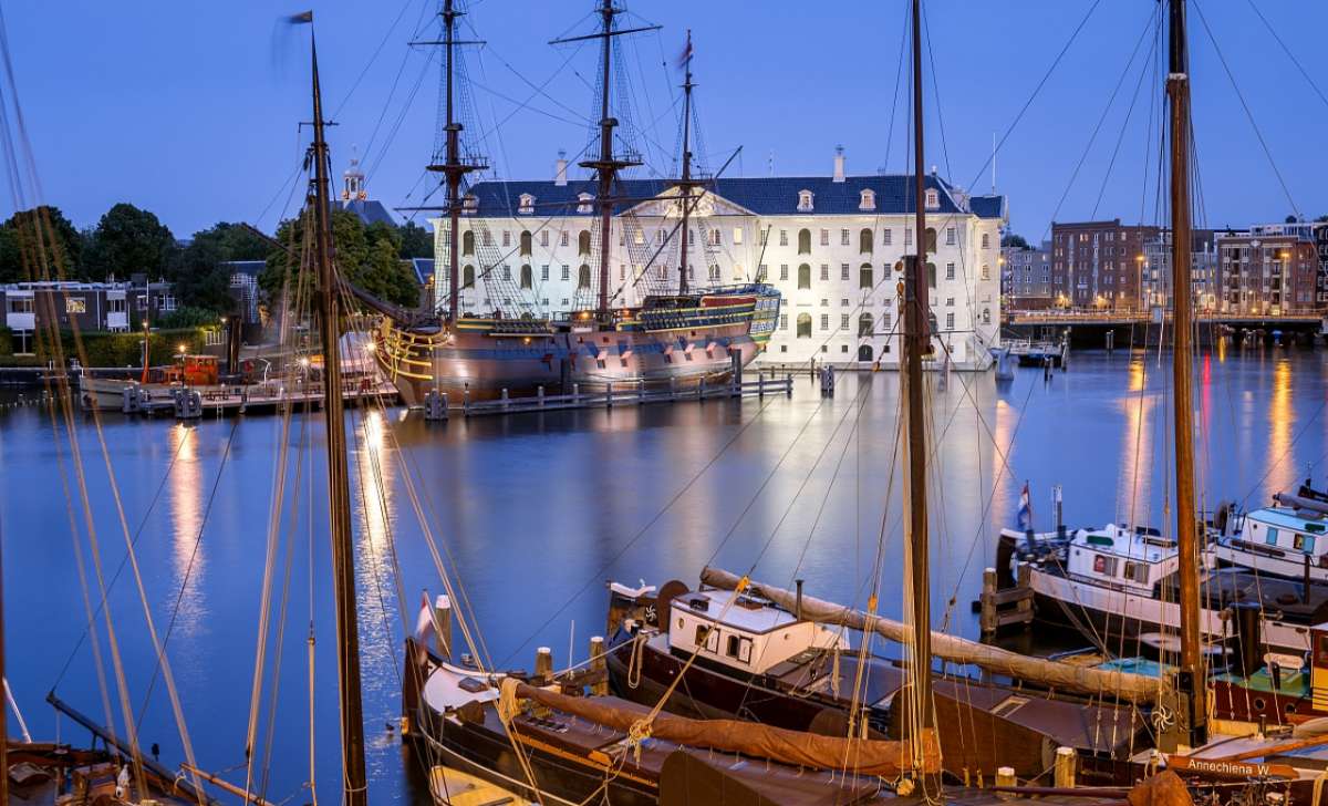 荷蘭航海博物館建在運河港灣旁,以前曾經是荷蘭海軍的軍火庫。博物館展出荷蘭黃金時代航海和殖民的歷史資料。外面是荷蘭東印度公司“阿姆斯特丹”號帆船的原樣復制品。船上布置的場景使參觀者可以了解當時航海生活的情景。
