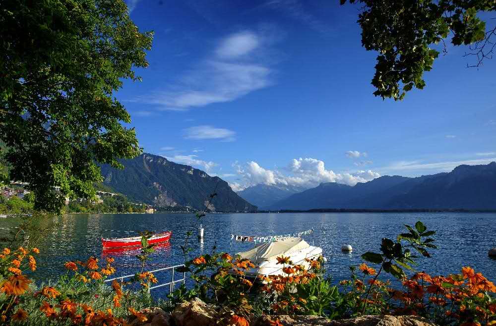 日內(nèi)瓦湖以勃朗峰橋?yàn)橹行模睾珗@四布,如激流公園、玫瑰公園、珍珠公園、英國(guó)花園、植物園,還有湖畔的花鐘。湖濱別墅連綿,紅墻碧瓦掩映在綠蔭叢中。花木扶疏,水色澄碧,素被視為人間勝境。