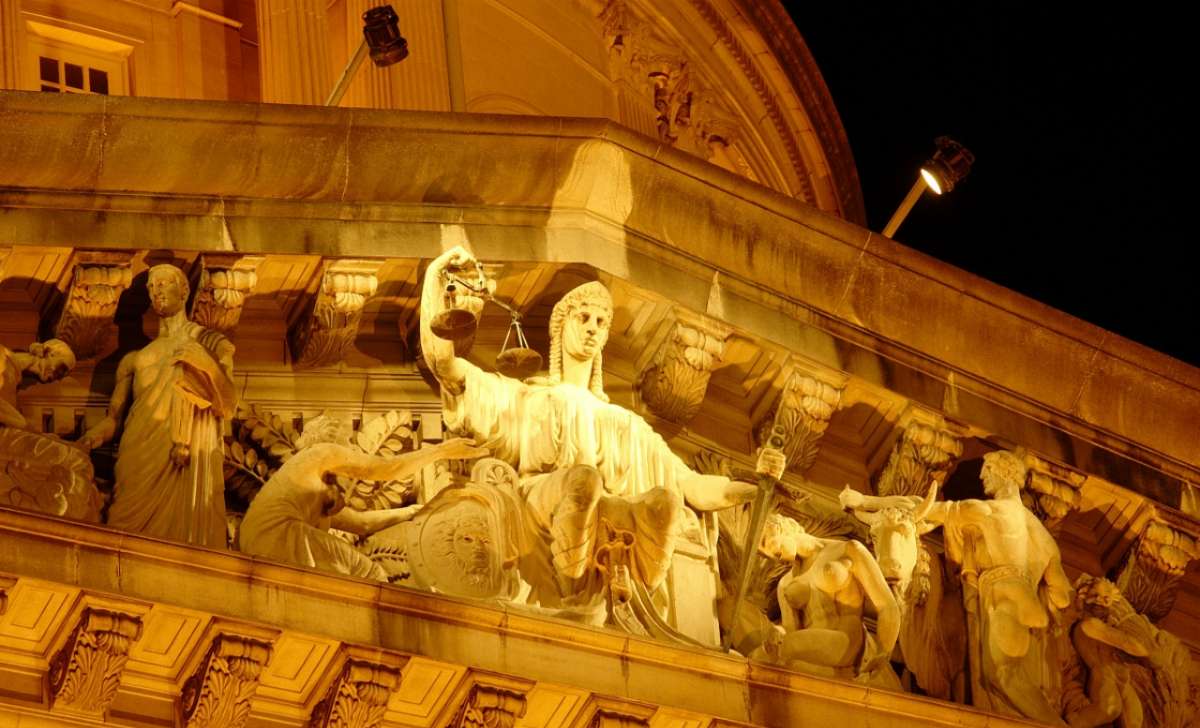 最高法院正面山墻飾內三角面部分的雕塑,中間部分的人物代表公正,左側人物代表迷失者,正向前者乞求保護。版權所有山東聊城聊之旅國際旅行社有限公司,轉載必究!人物的旁邊有兩位立法者,手中拿著書本,代表法律。代表公正人物右側,有另一人物,鞠躬感恩,后面跟著的是一個人和一頭雄牛,代表財富與繁榮。另有兩個孩童,手持小麥一把,代表法律與公正所帶來的豐盛生活。