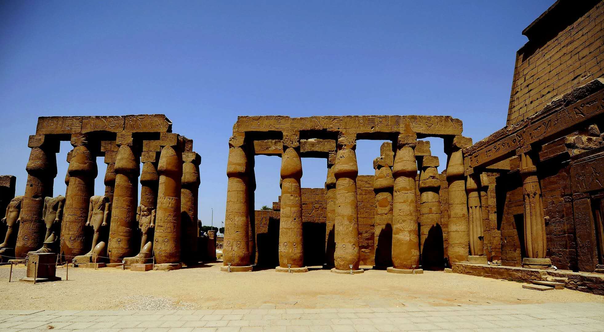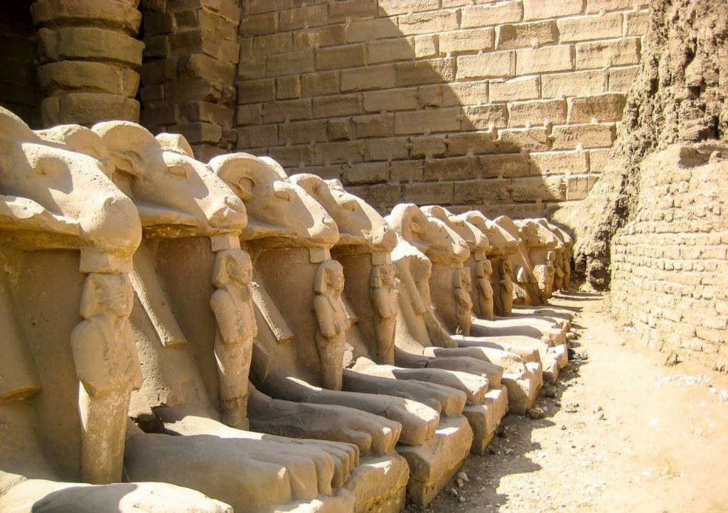 早晨,通紅的陽光仿佛來源于卡納克神廟中的方尖碑。光線爬過高大的塔門,先是染紅多柱廳“盛開”的蓮花大圓柱,然后投射在拉美西斯三世的神殿上。可以預見,再過一會兒,陽光將移到排列整齊的獅身公羊頭像上,那是阿蒙-瑞神的化身之一,每只獅身公羊頭像下都站立著一個小小的法老,接受著神的庇佑。