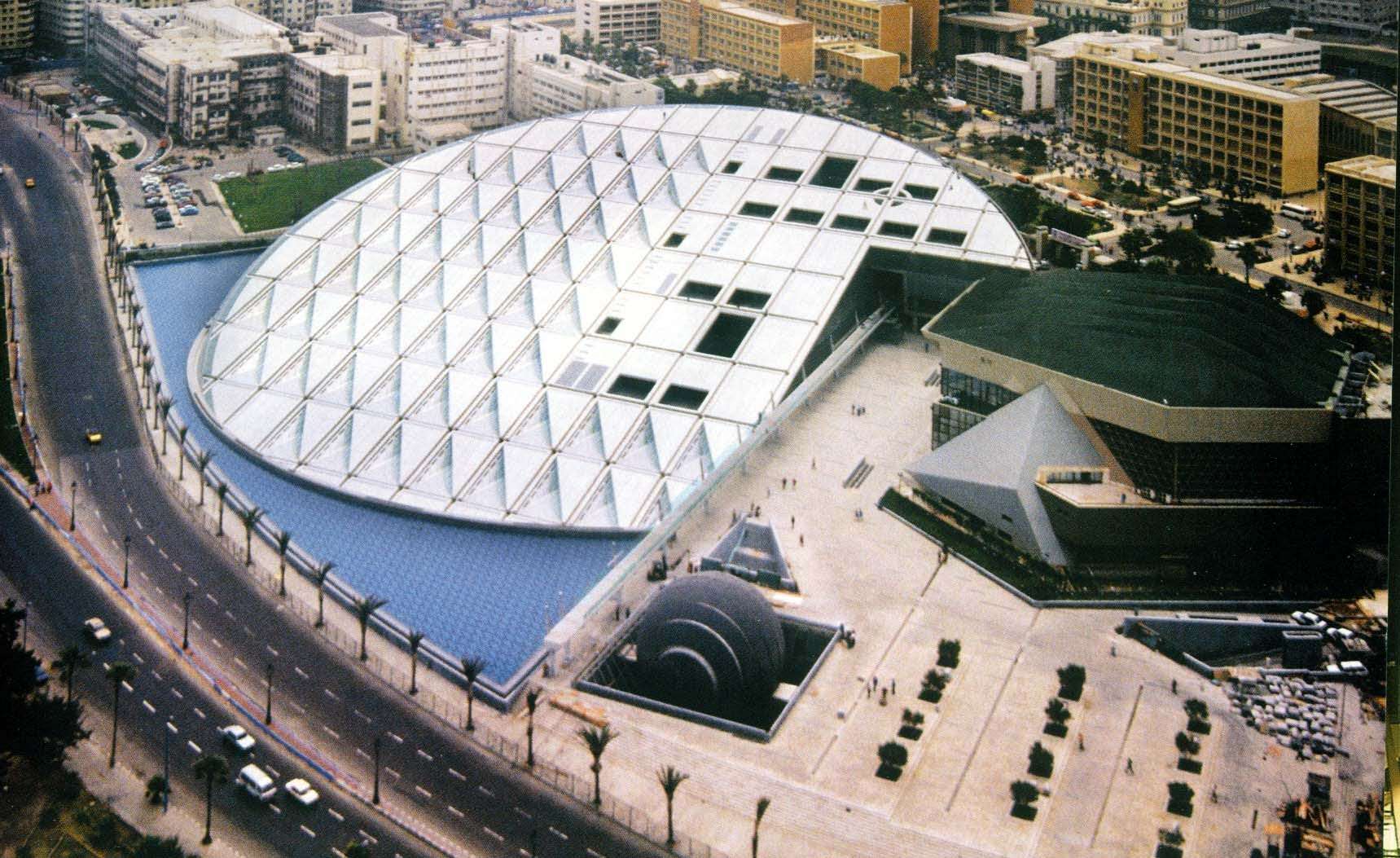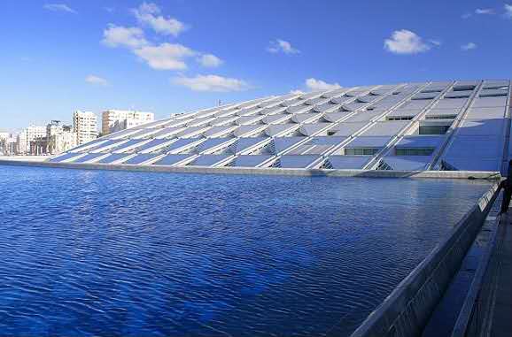 1995年后重建了亞歷山大圖書館,占地4萬平方米,它不僅是埃及的重點建筑項目,也是聯合國教科文組織在世界范圍內的重大科研和建筑項目,它的造型是從77個國家的設計中優選的