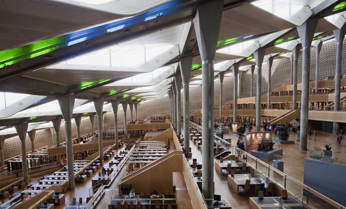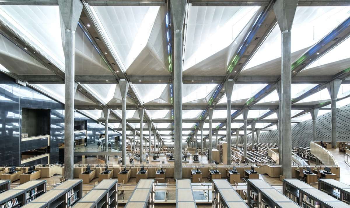 今天的圖書館達到了既現代又有厚重歷史感的目的。它向地中海傾斜的外部圓形建筑據稱是既懷念古時的圓形港口,又聯想到宇宙的模樣。鋼架玻璃的屋頂,和柱頂的四棱透鏡使透入的光線彌散,且隨日光的移動而不斷變化。圖書館的墻體由2米寬1米高的巨石建成,6300平方米的石頭墻上刻滿了阿拉伯文字、圖案、符號,此外還有音樂和數學符號,以及世界各種文化的文字符號;這些圖案均系手工鑿刻而成。館內寬敞明亮,確有傳統圖書館的風范。
