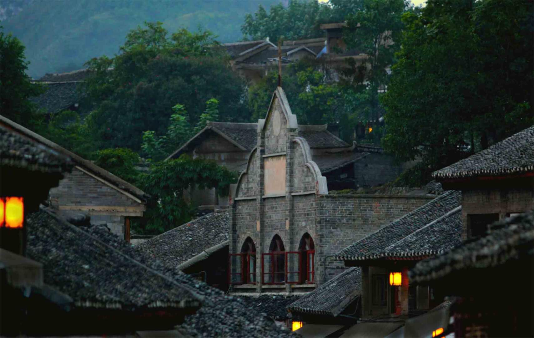 青巖古鎮有著深厚歷史背景的建筑。爬上鎮邊一側不算太高的山坡可以鳥瞰小鎮的全景,小鎮并不是建造在一個平面上而是建造在高低不平的山坡面上,從高處望去,整個小鎮的格局給人一種在別的古鎮中難以看到的立體美感。青巖古鎮中除了眾多的寺廟,竟然還保留著一座基督堂和一座天主堂,多種宗教和諧共處,形成其獨特風格。