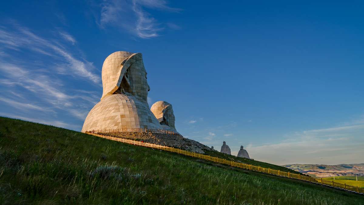 霍林郭勒市可汗山景區總投資5200萬元,占地面積13000余平方米,景區由山門、蒼狼之路、蒙元兵陣和蒙古帝王群四部分構成,其中成吉思汗頭像雕塑高達50米。
