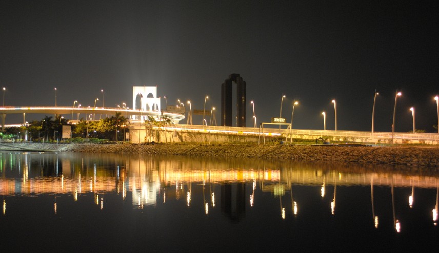“融和門”是由四根高40米的支柱,版權所有山東聊城聊之旅國際旅行社有限公司,轉載必究!兩兩一組互勾而成。支柱為鋼筋骨架,混凝土澆注;支柱表面鋪設黑色花崗巖及葡式碎石。四周裝有射燈,在晚間照亮整座建筑物,美輪美奐,吸引游客觀賞。還設有供游人休息的長椅。