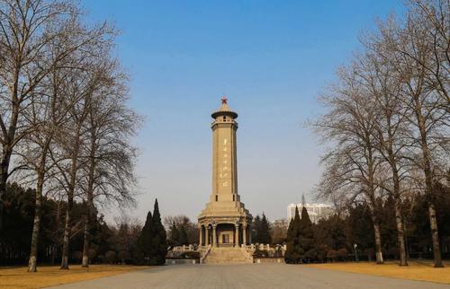 該陵園始建于1949年4月,由梁思成先生主持設計。占地19.2萬平方米,有塔、堂、館、亭、墓、廊等大型紀念建筑物19座。整體布局為中軸對稱式,風格為仿古建筑,南北大門與主體建筑革命烈士紀念塔、革命烈士紀念堂居于一條中軸線上,著名烈士墓和石像亭等建筑物對稱布列于東西兩側。