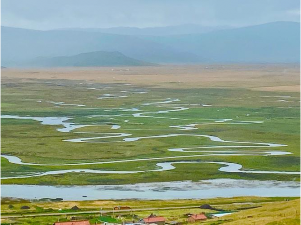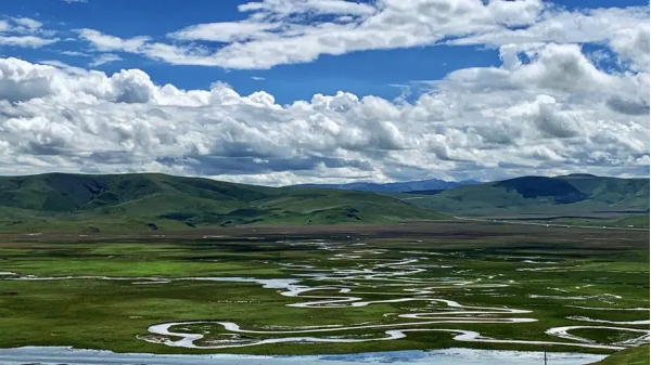 站在觀景臺上,極目遠(yuǎn)眺,遠(yuǎn)處濕地上九曲河水靜靜流淌,藏區(qū)特有的經(jīng)幡隨風(fēng)飄揚,牧民的房子上縷縷炊煙裊裊升起,給寂靜的草原增添了些許生機(jī)。