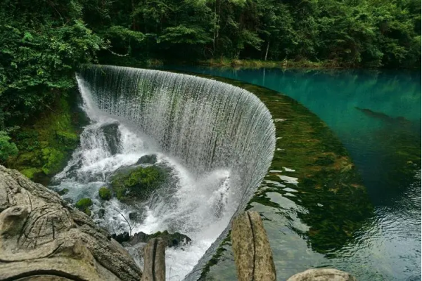 犀牛潭是九龍河大瀑布下面的最后一個潭,從這個潭開始,就是站在大瀑布上可以一收眼底的一目十瀑。從以堵勒村及鴨子龍潭過河對岸,就從潭上邊河床上的蛤蟆石走過。這個潭也不大,但就是怪,有時從上邊流下來的水是清的,可再從潭里流出來,就變成了渾的。老輩人說:“那是正好碰上犀牛翻身哩!”