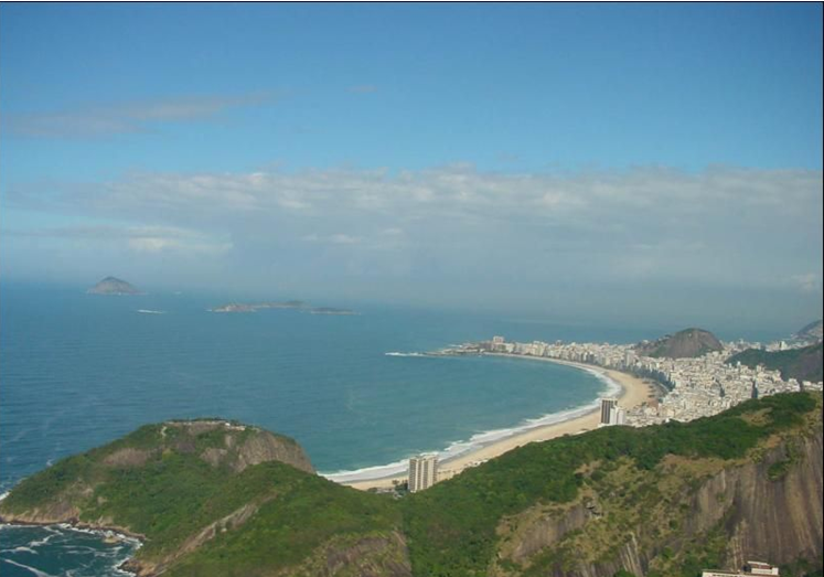 遠處,一條長龍飛架海灣兩岸,那是著名的尼泰羅伊大橋。這座大橋全長十四公里,把里約與對岸的尼泰羅伊市連結在一起;這一邊是浩如煙海的大西洋,波光粼粼的海面上不時地駛過巨大的海輪,三三兩兩形狀各異的小島在海浪潮水的拍擊下,時隱時現。遠處,科帕卡巴納海灘像一彎新月,橫臥在大西洋身旁,五顏六色、南來北往的小汽車宛若無數的甲殼蟲在月牙般的海濱大道上緩緩爬行……