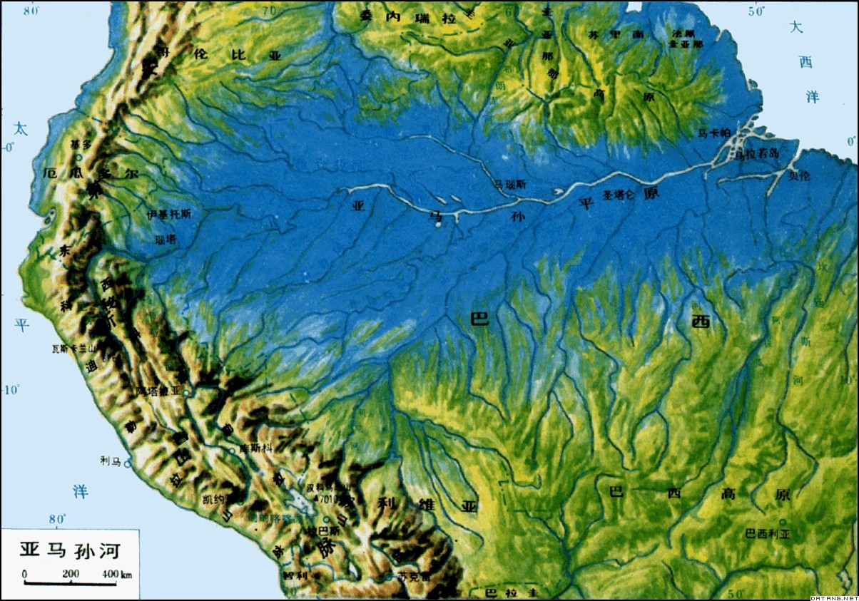 亞馬遜河流域西高東低,南高北低。上游源頭為安第斯山脈及太平洋沿海沖積系統,海 拔在3000m以上;干流兩岸多為200m以下的安第斯山沖積層和內陸沖積層。往北為圭亞那高原(海拔300~400m),往南則為巴西高原(海拔300~1500m)。