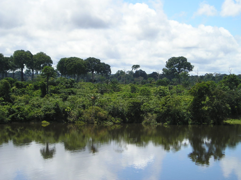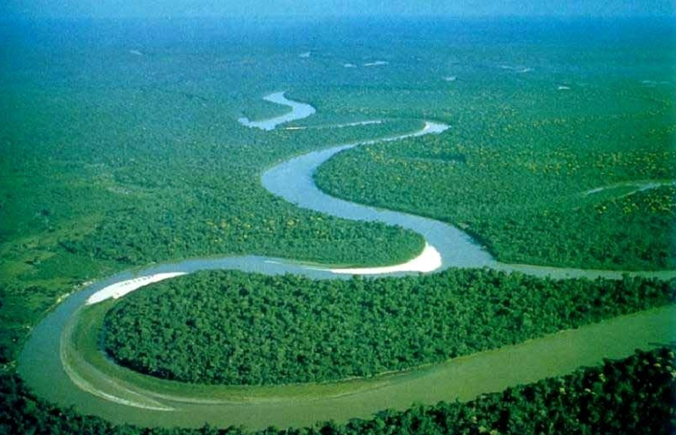 亞馬遜河中游流經秘魯、哥倫比亞、巴西、全長約為2200千米。在巴西北部,亞馬遜河水深45米,河寬3000米,流速緩慢;河中島洲錯列、河道呈網狀分布,兩岸河漫灘寬30~100千米,地勢低下,湖沿密布,排水不暢;河流兩側支流眾多,都發源于安第斯山東坡,呈羽狀分布。至中游末端,河寬至11千米,河深99米。