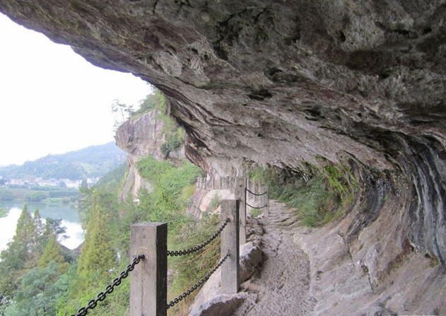 九龍壁:在水邊有一端奇特的巖壁,人們稱之為九龍壁。這是一條帶狀的層狀節理地質構造。整條節理帶長約100米,其整體與好溪水面幾近平行,最低處與水面相距不到1米,節理帶中洞窟高低、深淺不一,最高達4米,最深4米。因節理帶處于懸崖峭壁間,凝灰巖性巖層狀分明,起伏彎曲,橫生凹凸,如無數條虬龍盤石潛伏,故稱九龍壁,又名龍崖。
