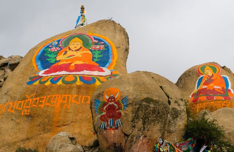 措欽大殿里還保存有二到四世達(dá)賴(lài)?yán)锏撵`塔。大殿四壁,繪有許多精彩壁畫(huà),有釋迦牟尼的百行轉(zhuǎn)圖、人間形成圖、生死輪回圖等。措欽大殿東邊有一個(gè)半地下的很小的山洞,只能容一個(gè)人進(jìn)入,名叫“讓迥瑪”。它原來(lái)是宗喀巴關(guān)靜修的地方,也是哲蚌寺最早的建筑。