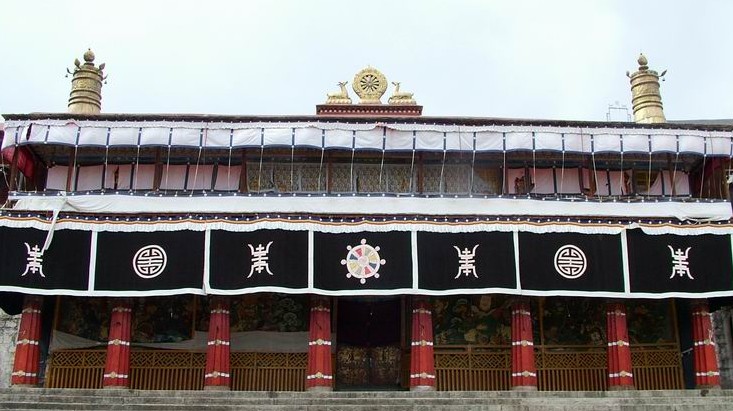 設(shè)甘珠爾拉康,藏《甘珠爾》經(jīng)。大殿3層是強(qiáng)巴佛(未來(lái)佛)殿。內(nèi)供強(qiáng)巴佛八歲時(shí)的等身巨形銅像。這尊強(qiáng)巴佛像是當(dāng)年宗喀巴在世的時(shí)候由他親自開(kāi)光的,極為著名,亦名“強(qiáng)巴通真”。除了宗教的意義以外,它是西藏所有強(qiáng)巴佛里最通神的一尊,實(shí)在是西藏不可多得的藝術(shù)珍寶。強(qiáng)巴佛殿門(mén)上懸掛“穆隆元善”漢文匾額一方,是清朝時(shí)任駐藏大臣的琦善在他任滿(mǎn)調(diào)離西藏時(shí)(1846年)刻制奉獻(xiàn)的。大殿四樓是釋迦佛殿,據(jù)說(shuō)是以500兩銀子制成,兩旁置銀塔13座。